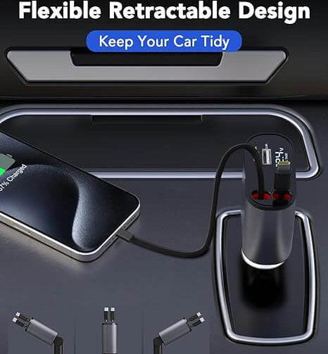 Features four charging connectors and a retractable cable mechanism, perfect for multi-device households and rideshare drivers.